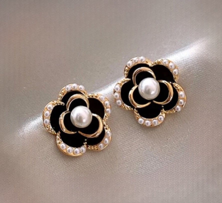 Σκουλαρίκια λουλούδι μαύρο με πέρλα και διακοσμητικές περλιτσες ατσάλι