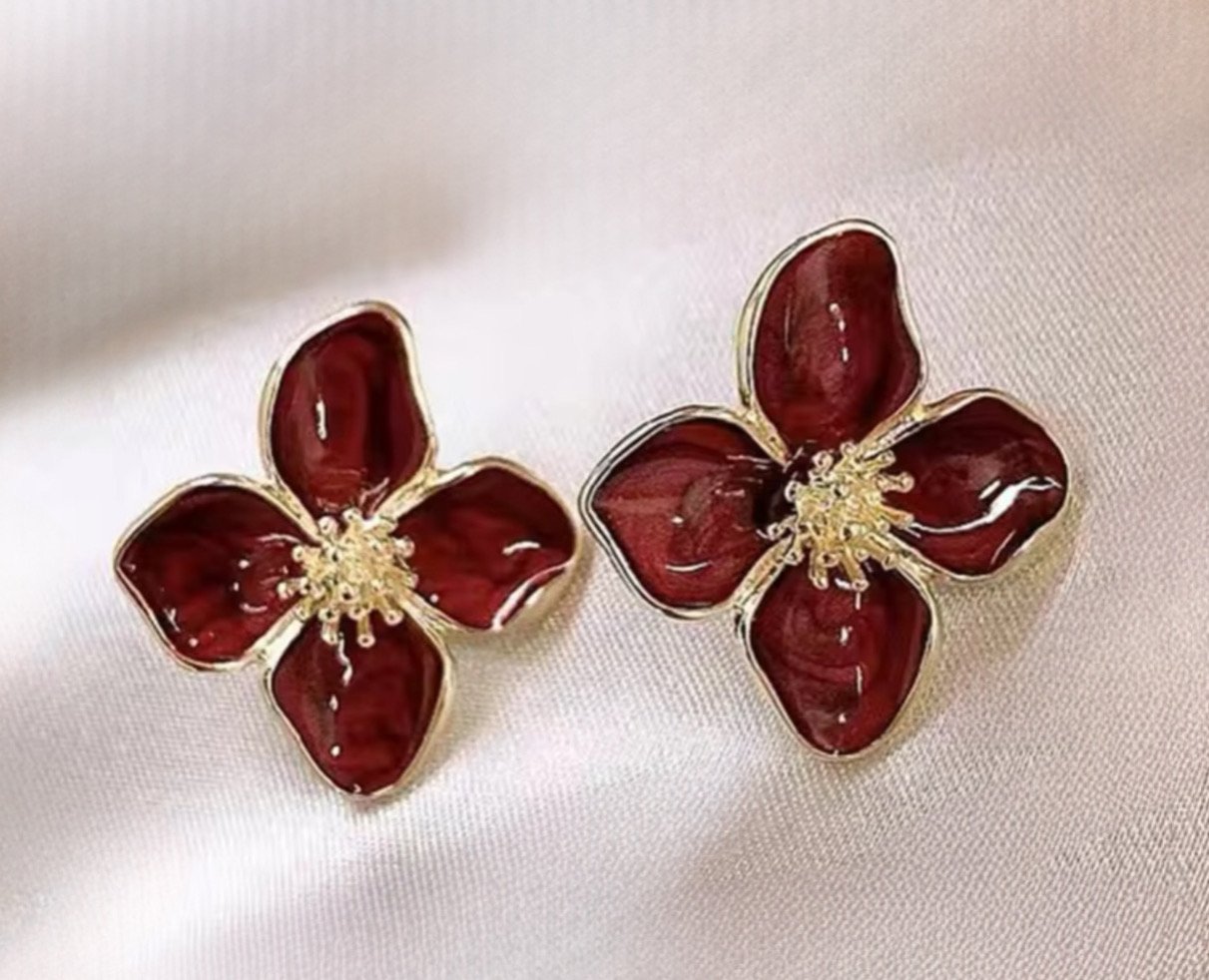 Σκουλαρίκια λουλούδι μπορντώ με χρυσές λεπτομέρειες ατσάλιΣκουλαρίκια λουλούδι μπορντώ με χρυσές λεπτομέρειες ατσάλι